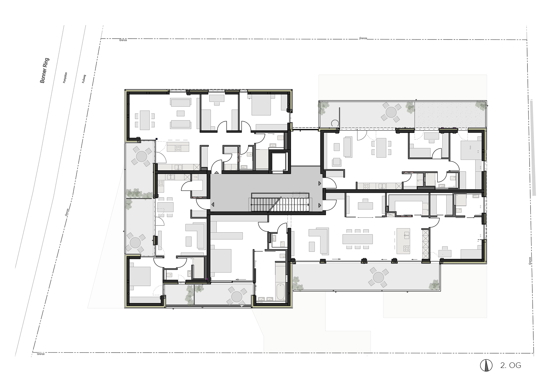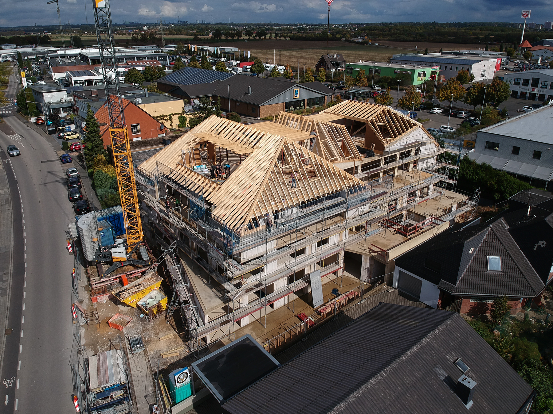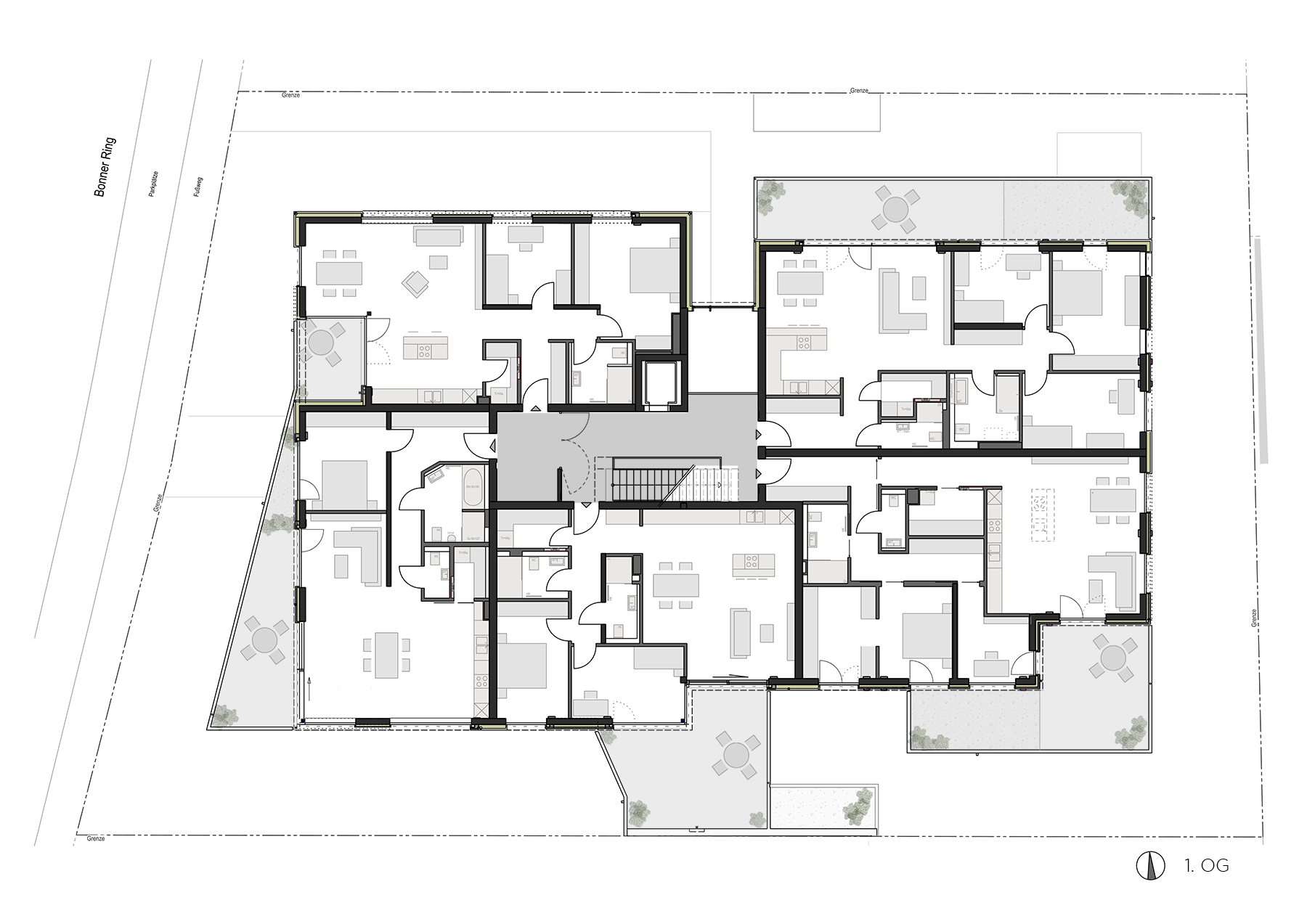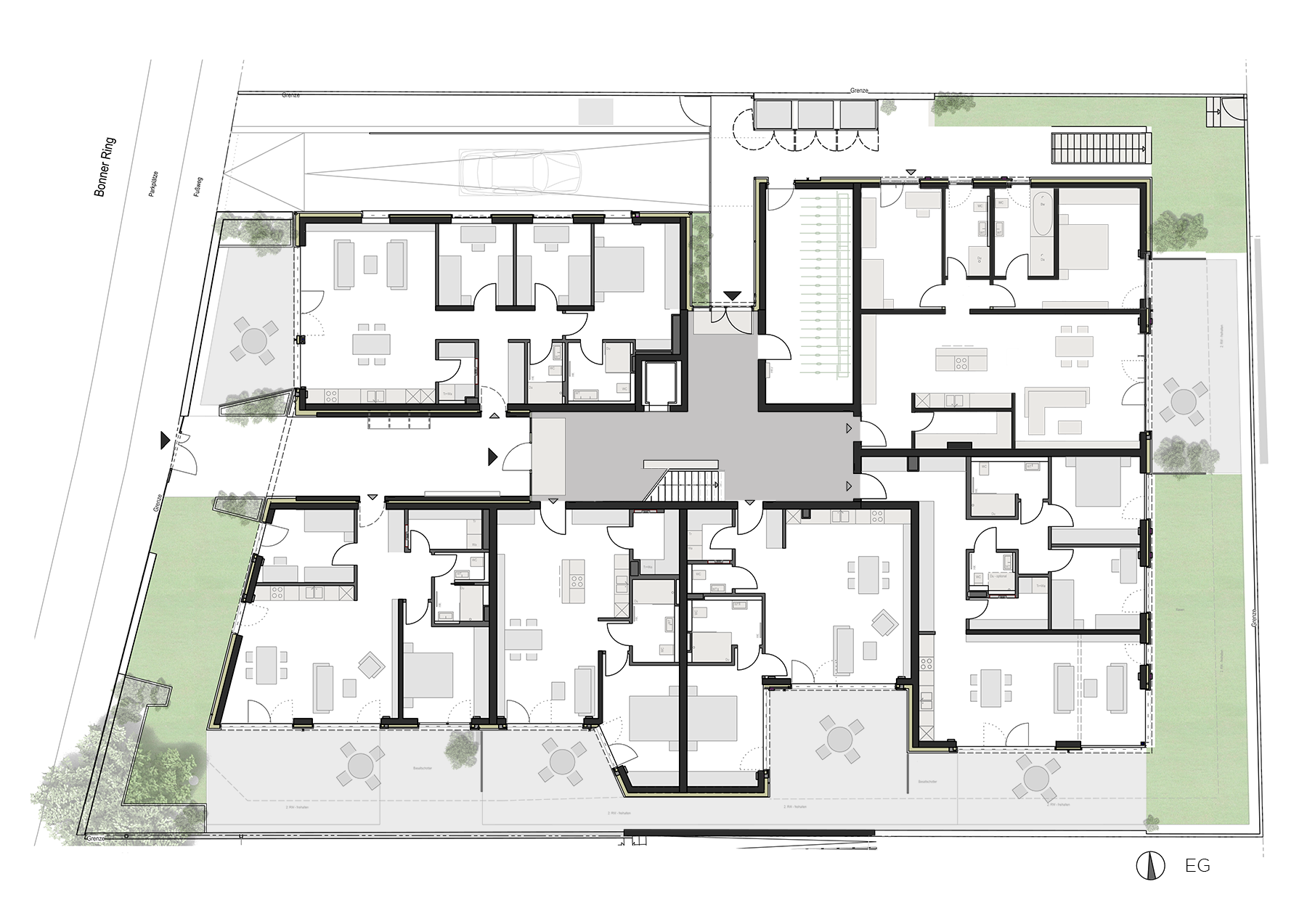Unser Baukörper behauptet sich elegant und zugleich selbstbewusst als Vorbote des städtebaulichen Wandels. Nah am Stadtzentrum Lechenichs, trägt er mit seinen 17 Wohneinheiten auf zuvor minder genutztem – aber bereits versiegeltem Grundstück – mit geringem Flächenverbrauch zur städtebaulichen Nachverdichtung bei. Der Wohnraumbedarf sowie stark ansteigende Immobilienpreise führen hier in durchmischter Ortsrandlage Lechenichs dazu, dass Wohnnutzung