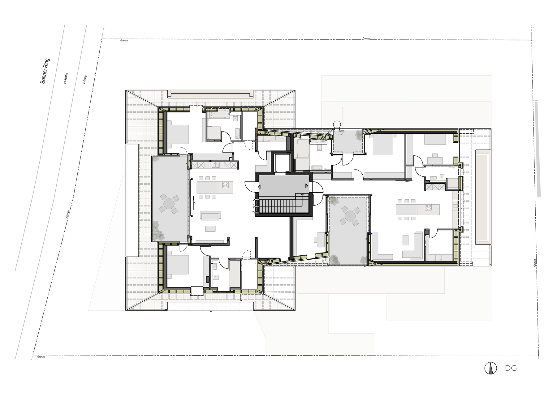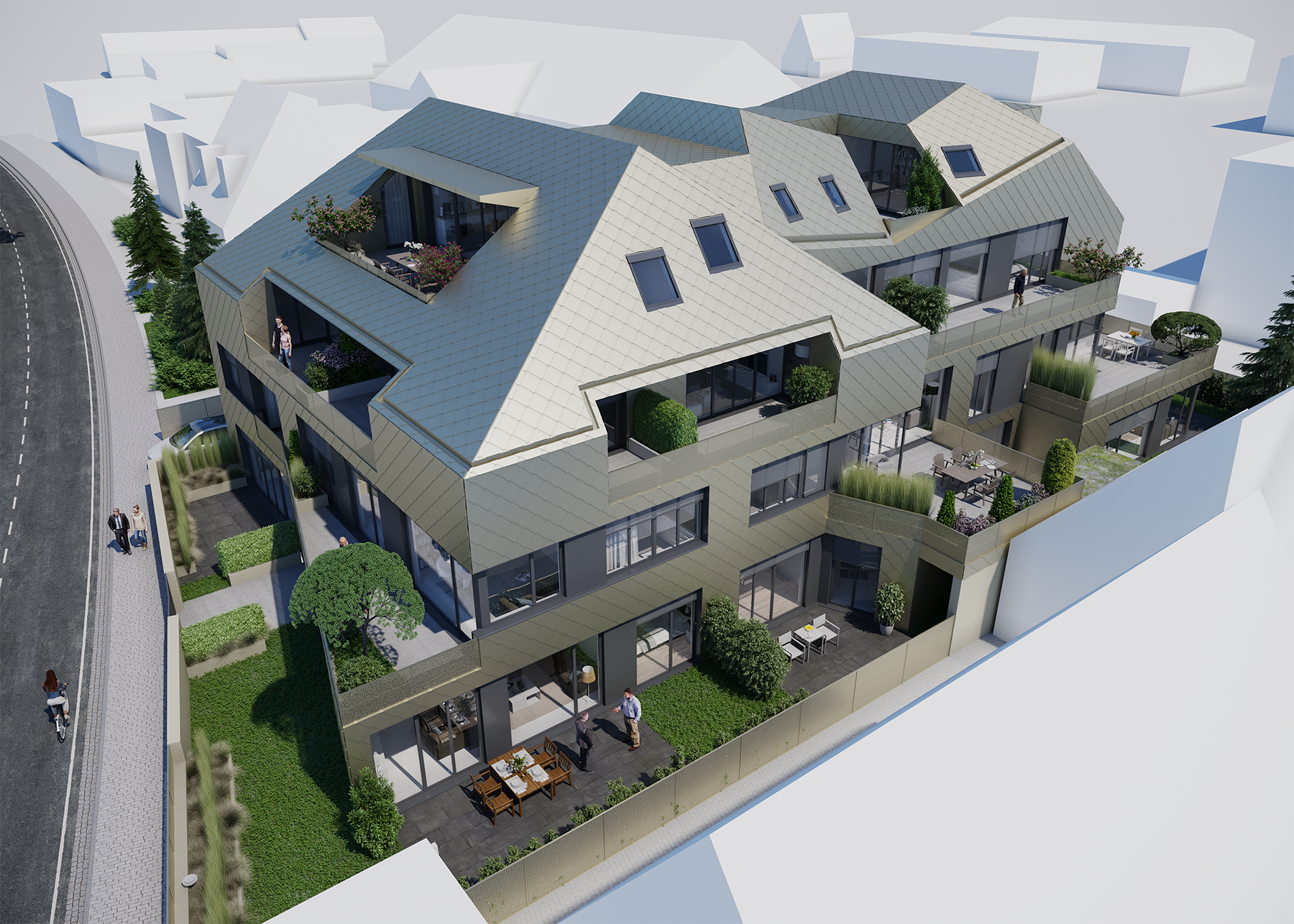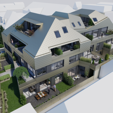 Wertige Architekturqualität vom Scheitel bis zur Sohle. 17 individuelle ETW, 380 m² Terrassen + 989 m² Tiefgarage für 24 PKW. Design stand hier nicht im Vordergrund! Es ist die Form, die sich nach §34 BauBG auf dem 1309 m² großen Grundstück gekonnt einfügt.