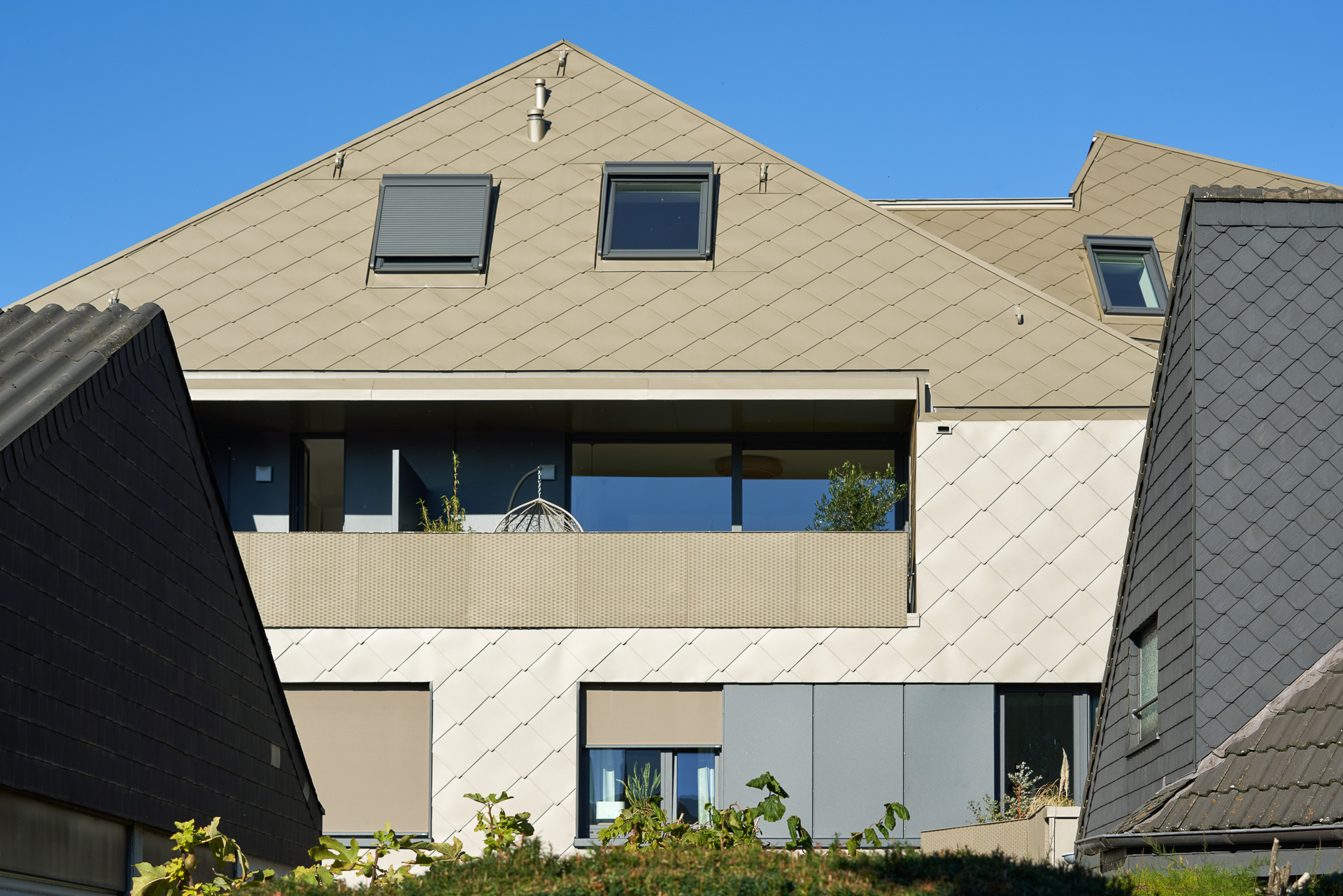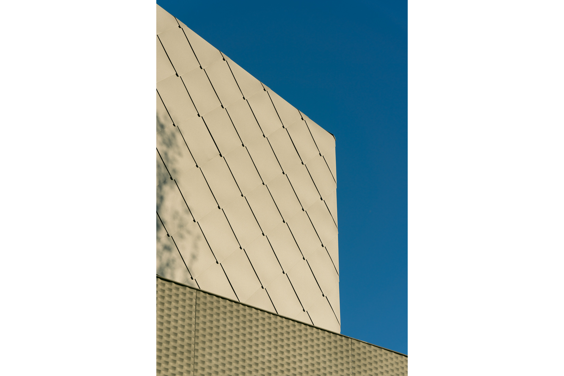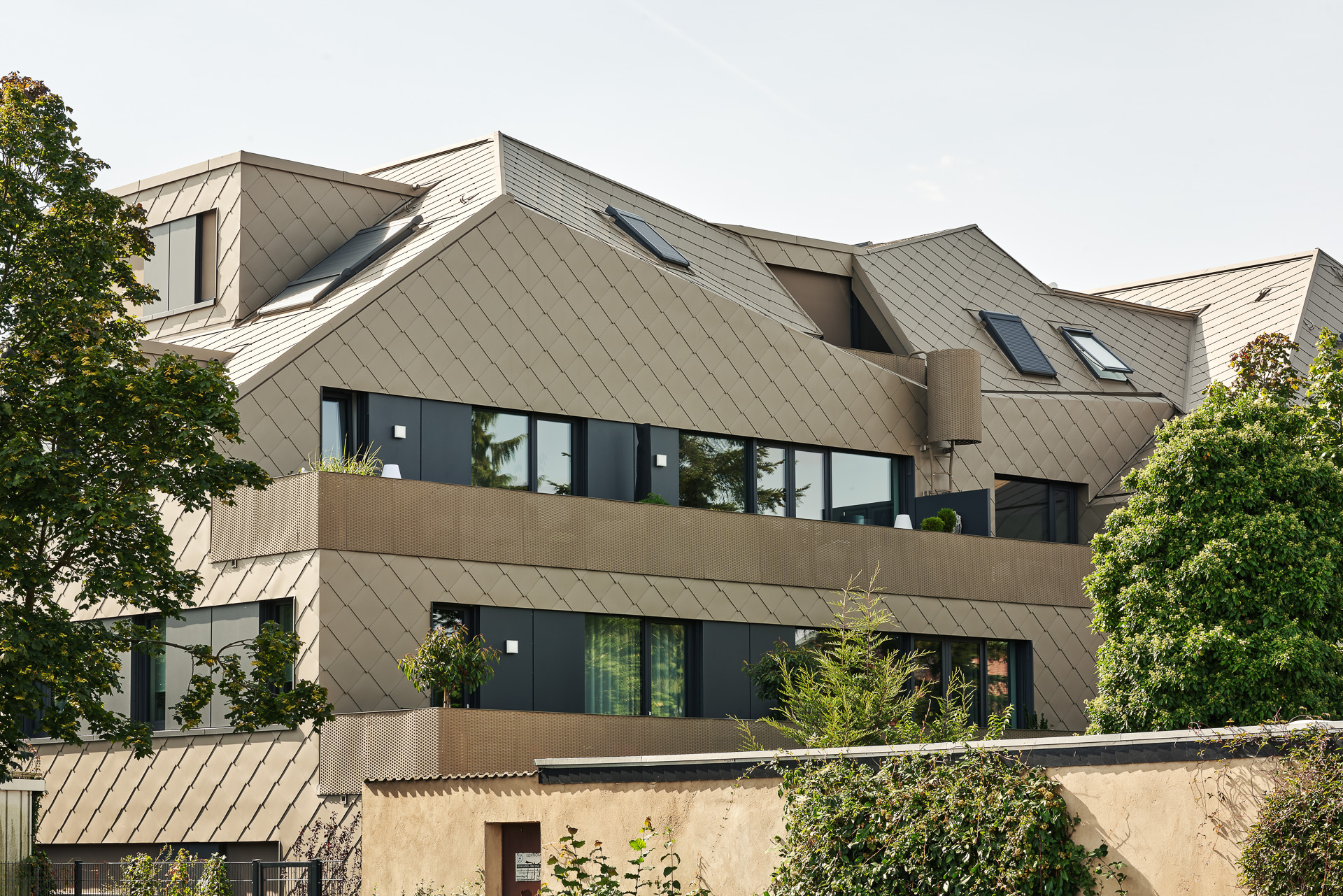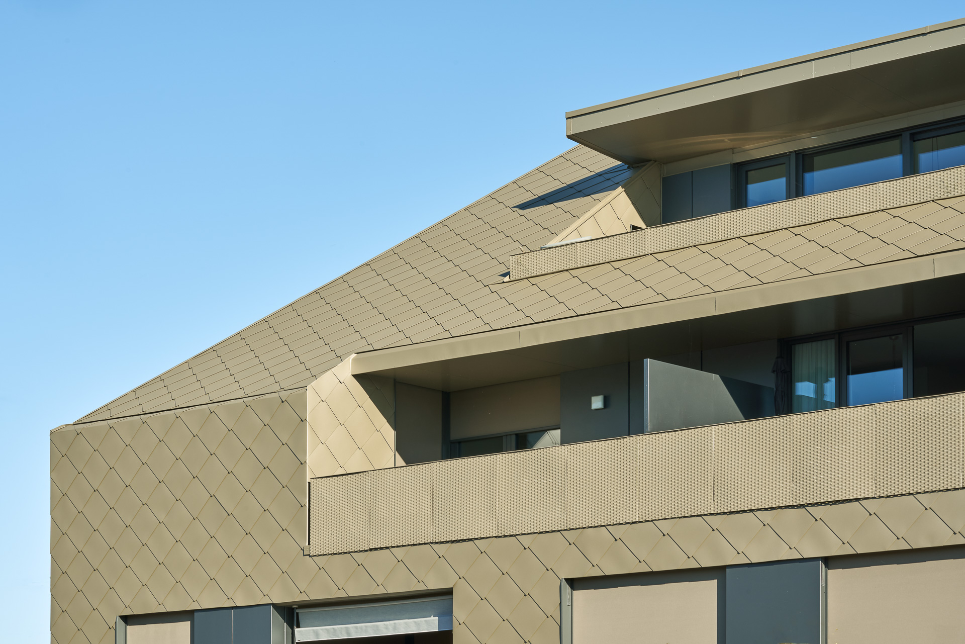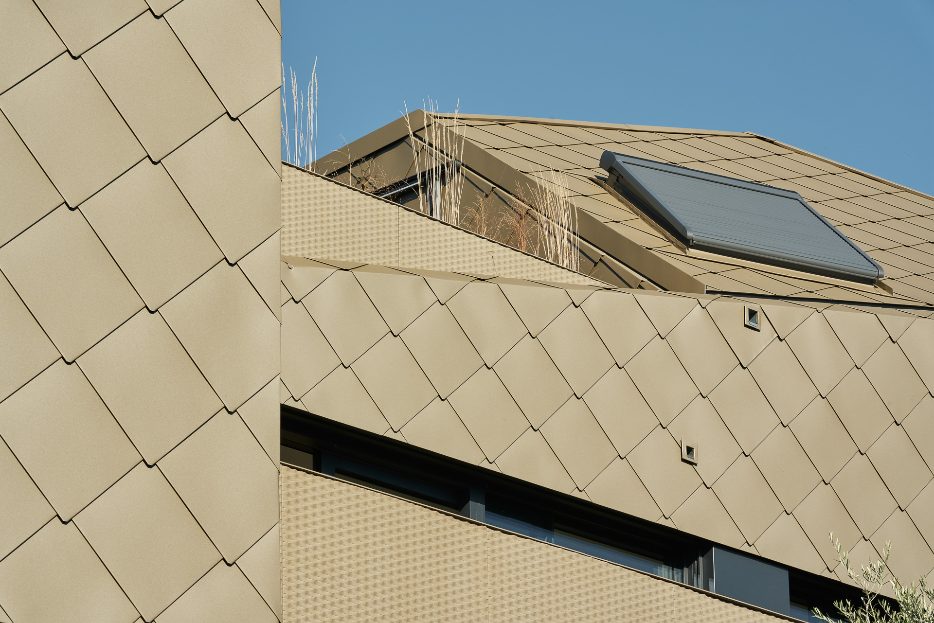 Besondere Aufmerksamkeit verschafft sich die kristallin wirkende Dachlandschaft. Sie unterstreicht, in einheitlicher Rautenschindel gehüllt, die monolithische Gesamtwirkung des Baukörpers, der so zur Landmarke wird.