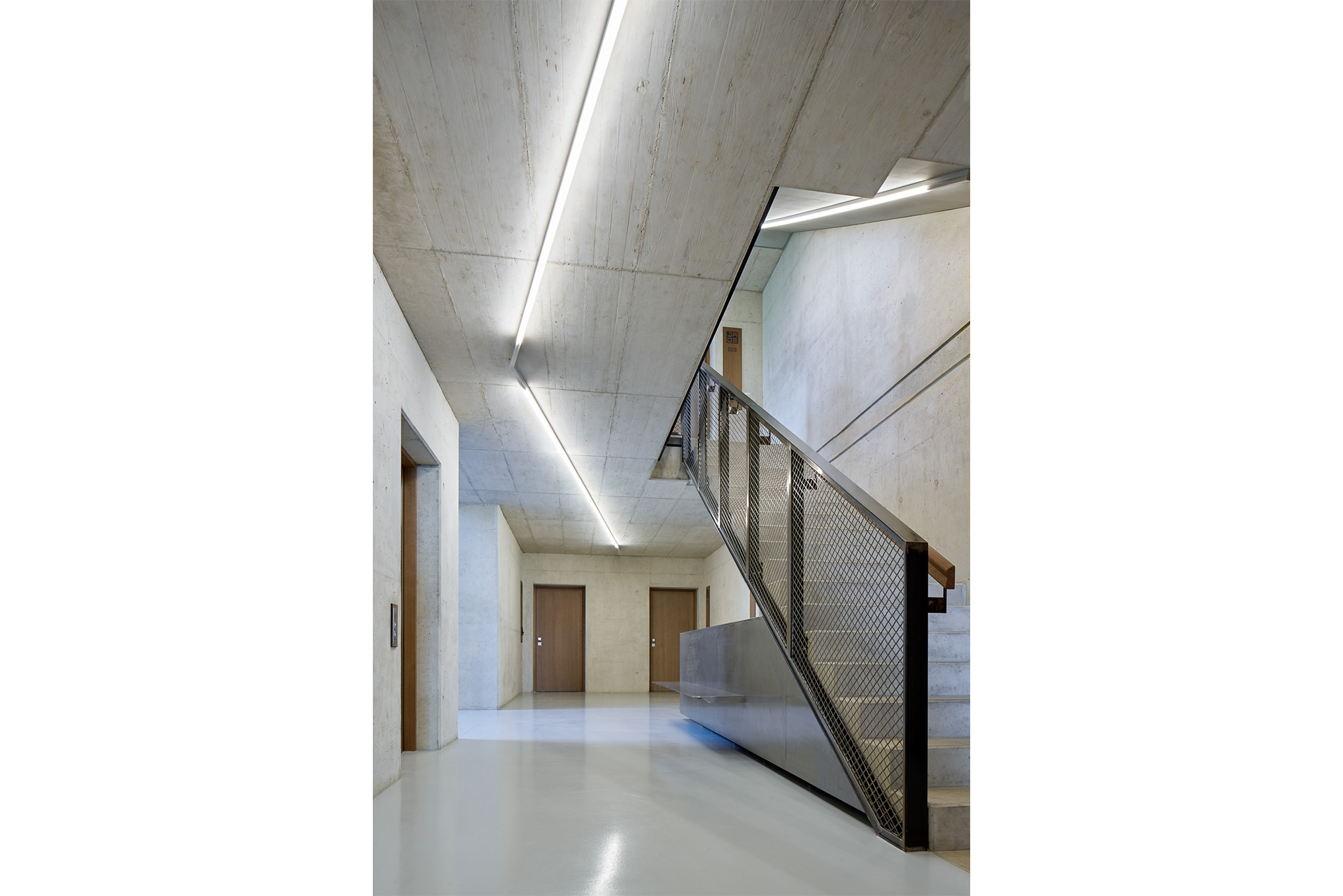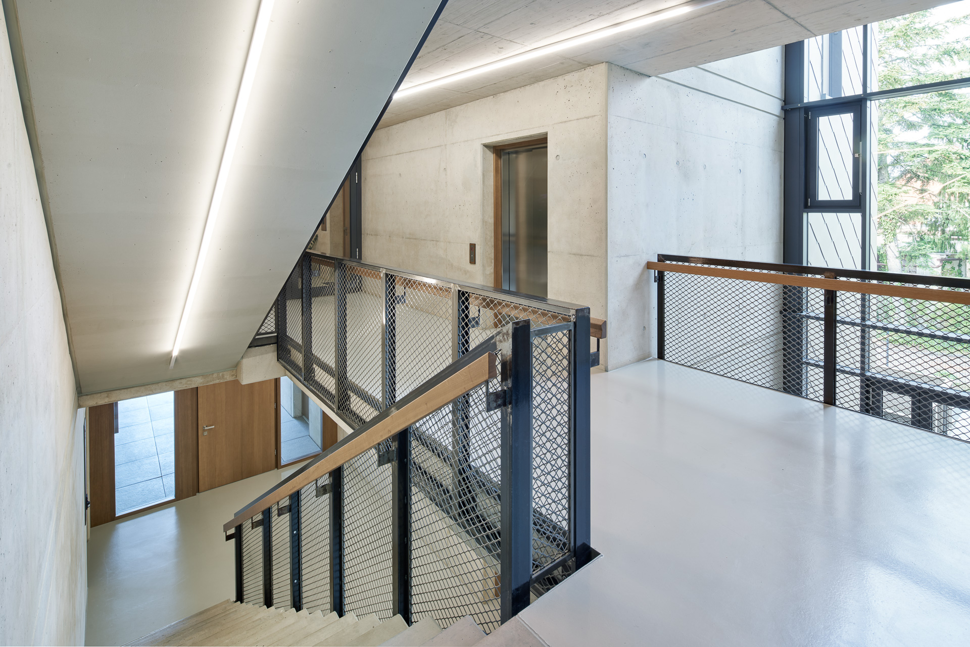 Eine weitere Besonderheit am Bonner Ring 21 ist das zentrale Treppenhaus. Ein heller, architektonischer Raum in Sichtbeton, Holz und rohem Stahl ermöglicht Begegnungen und Kommunikation.