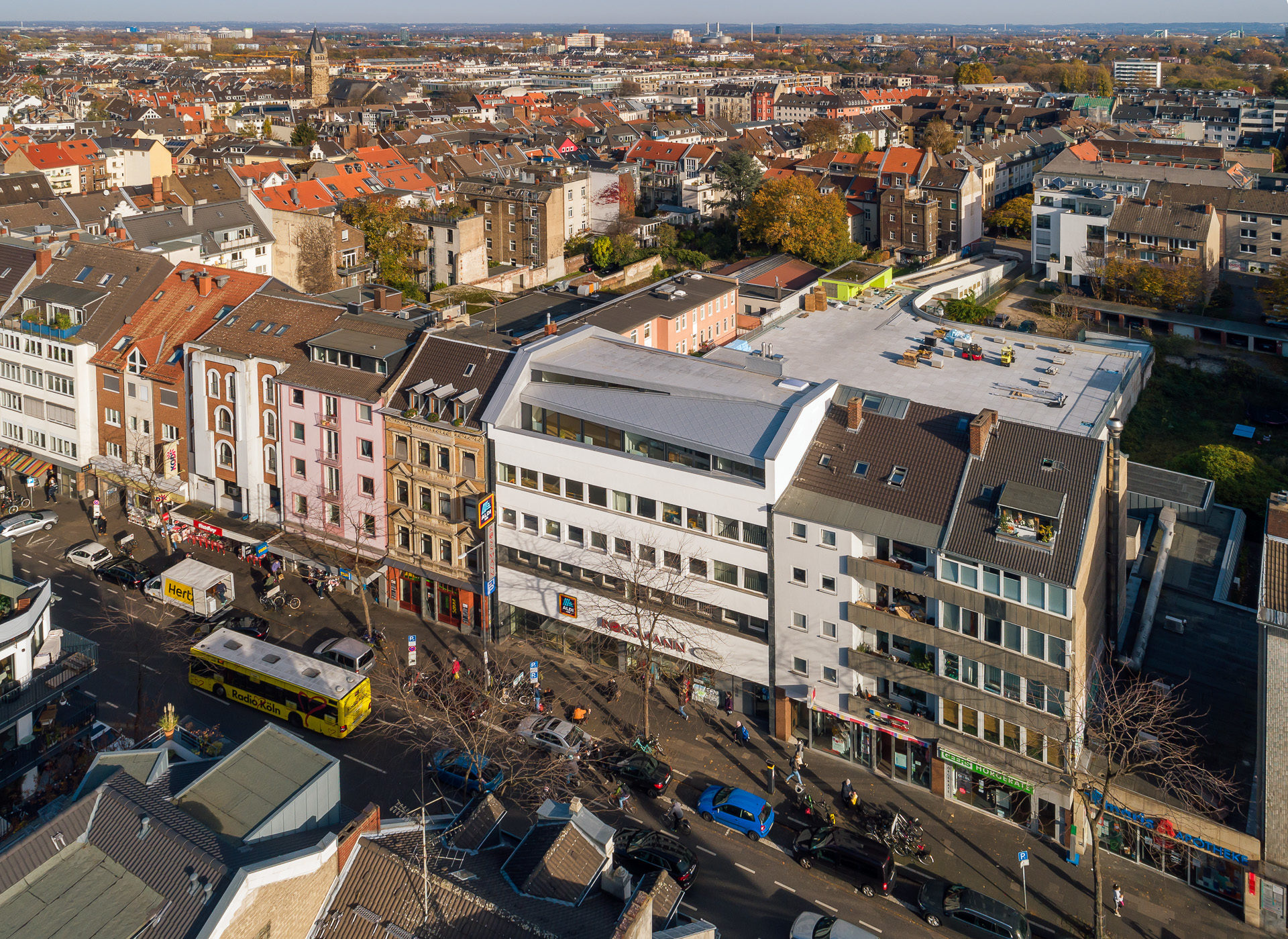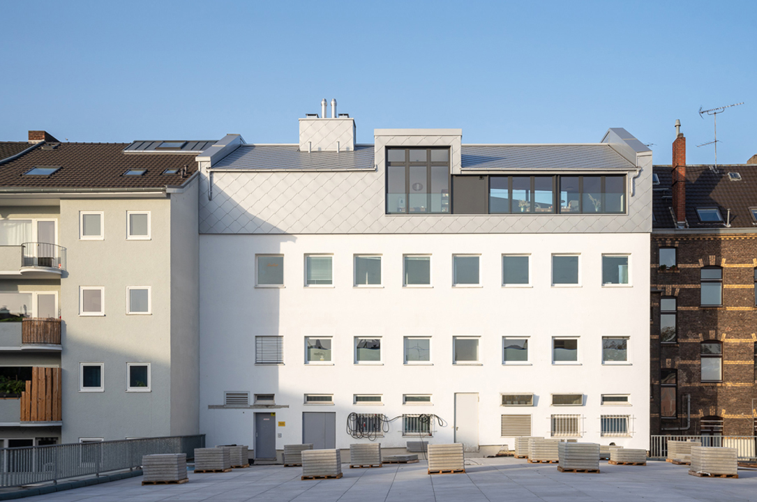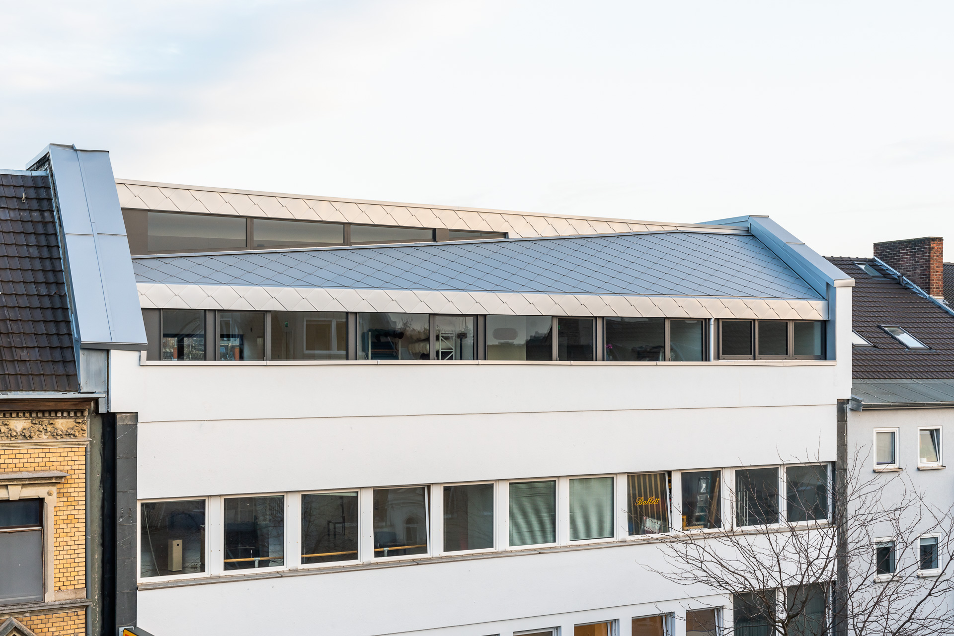 Das Gewerbeobjekt an der Neusser Str. 216 wies einen Sanierungsstau an seinen Dächern auf. Auf trapezförmigem Grundriss folgt das neue Steildach statisch und städtebaulich der vorgefundenen Ordnung. Ästhetisch und elegant steht die Form – bekleidet in heller Aluschindel – im Kontrast zu seiner Umgebung.