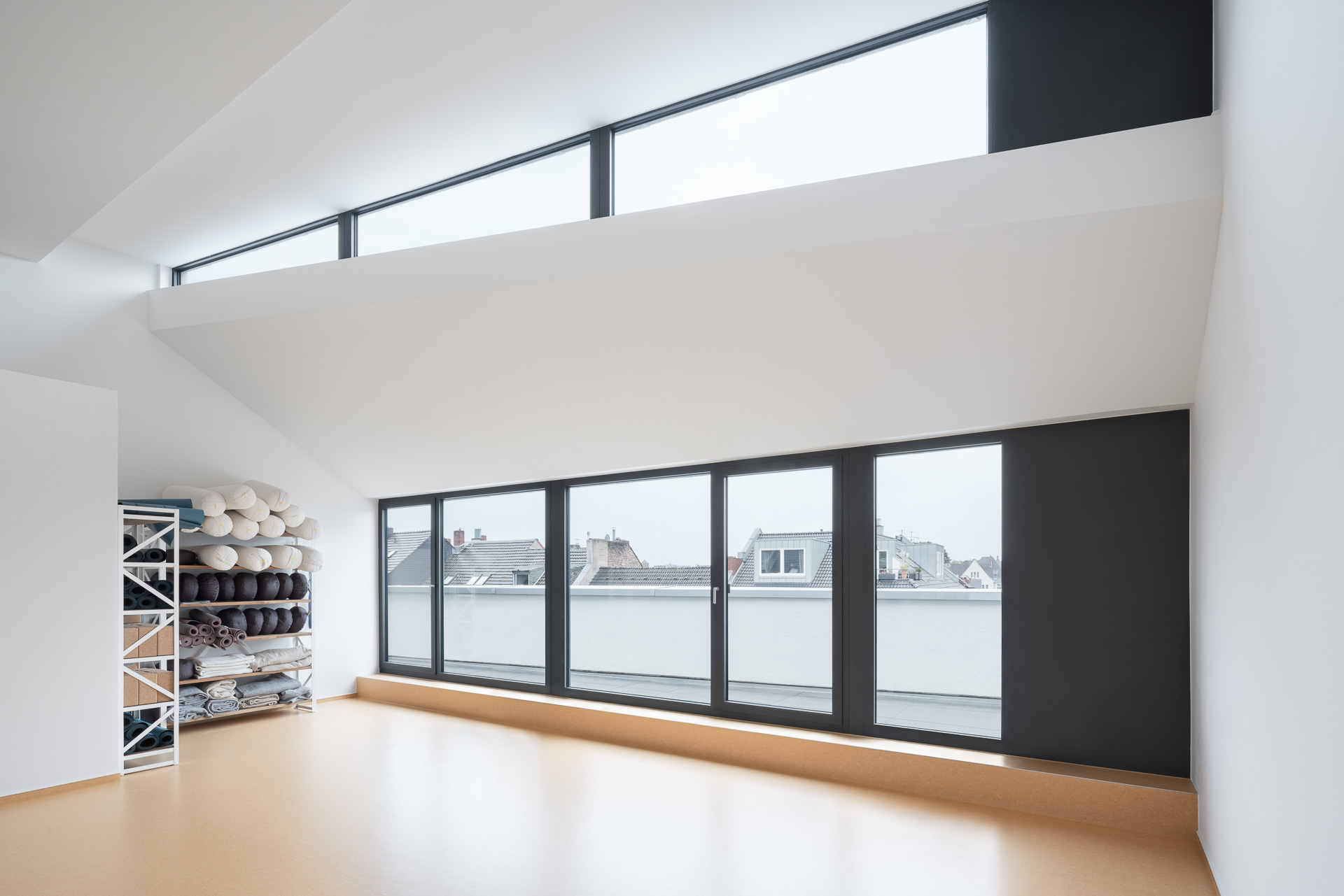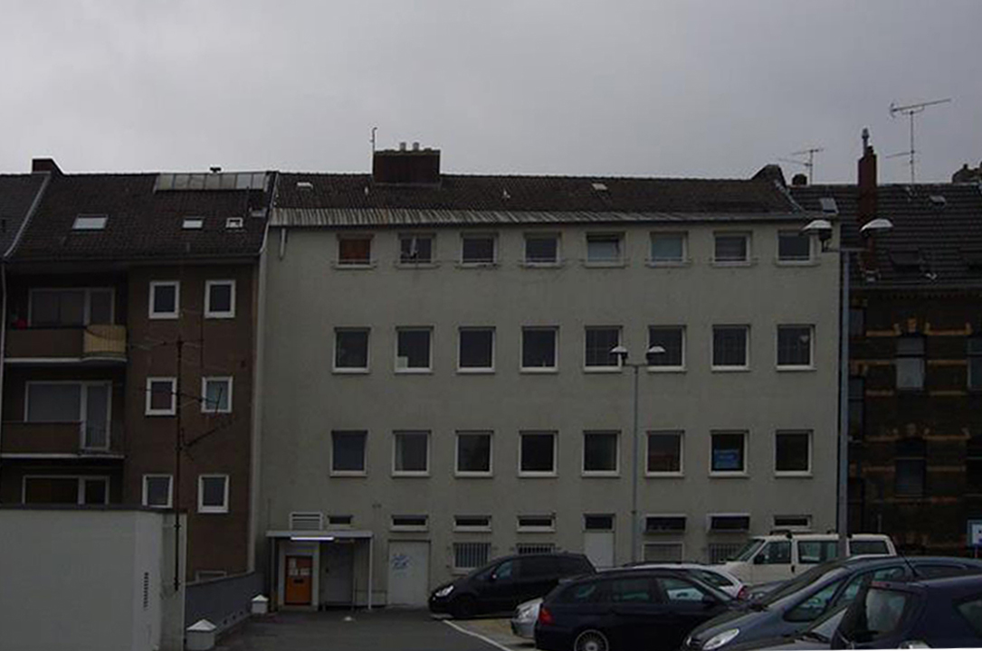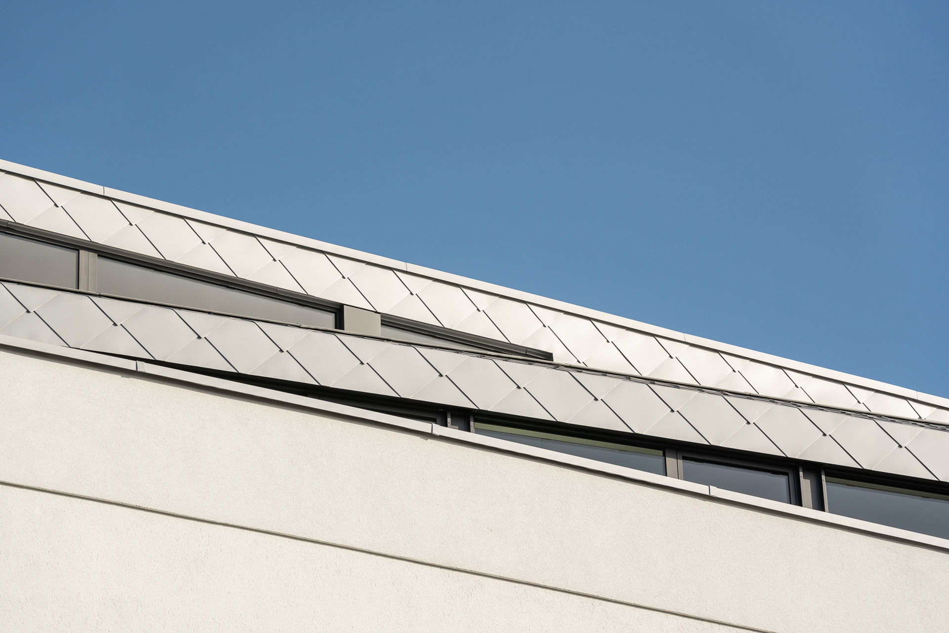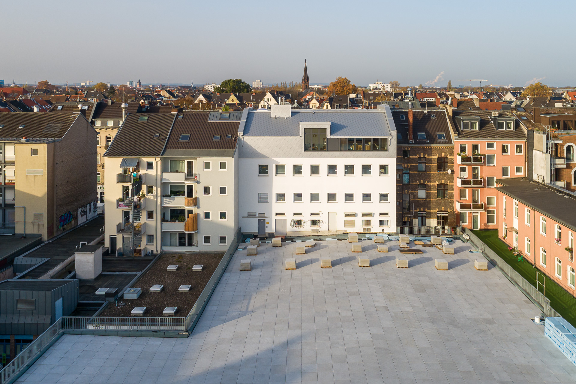 Das Gewerbeobjekt an der Neusser Str. 216 wies einen Sanierungsstau an seinen Dächern auf. Auf trapezförmigem Grundriss folgt das neue Steildach statisch und städtebaulich der vorgefundenen Ordnung. Ästhetisch und elegant steht die Form – bekleidet in heller Aluschindel – im Kontrast zu seiner Umgebung.