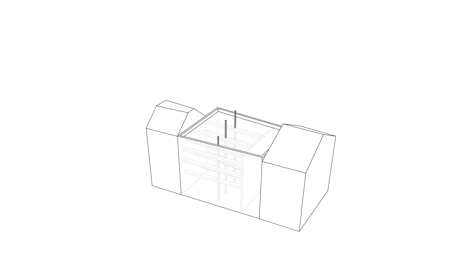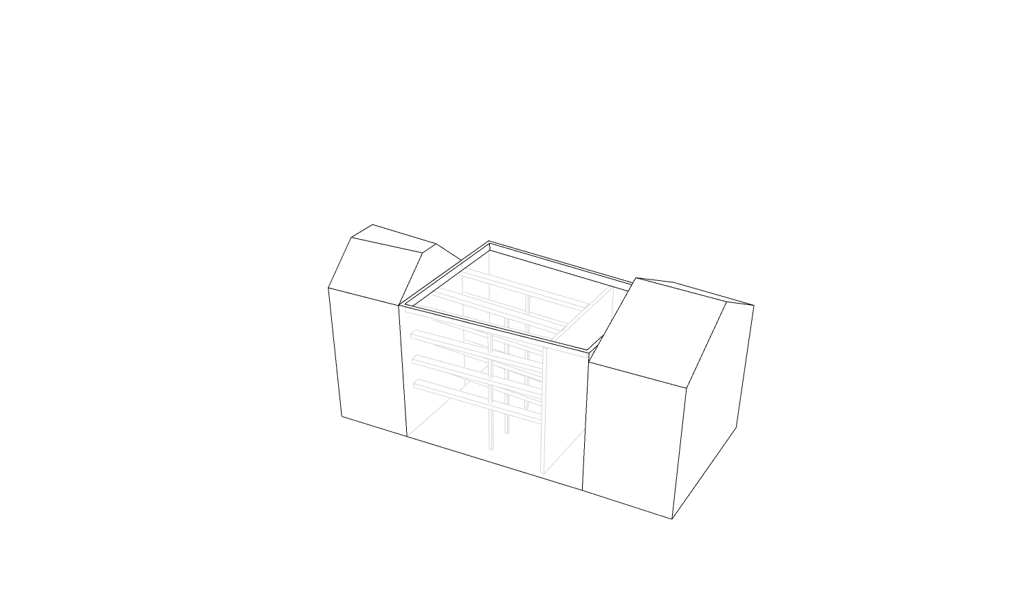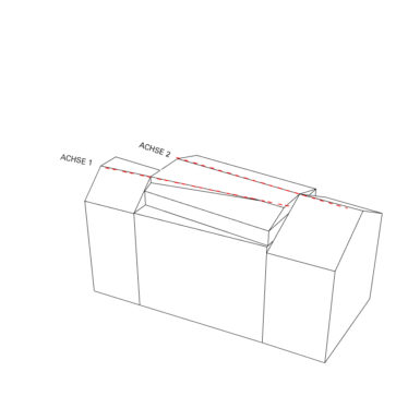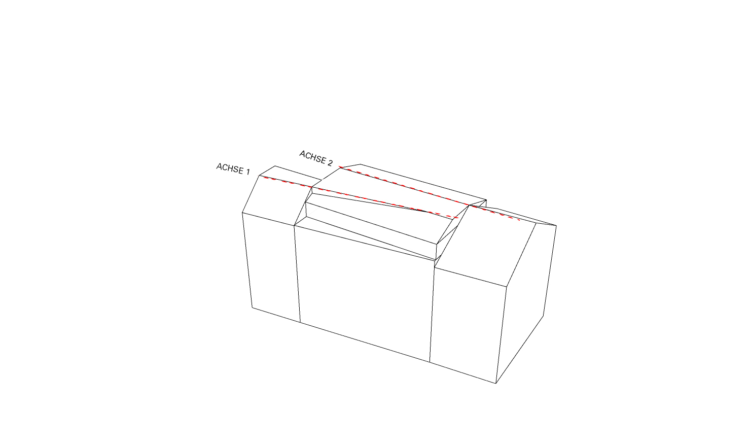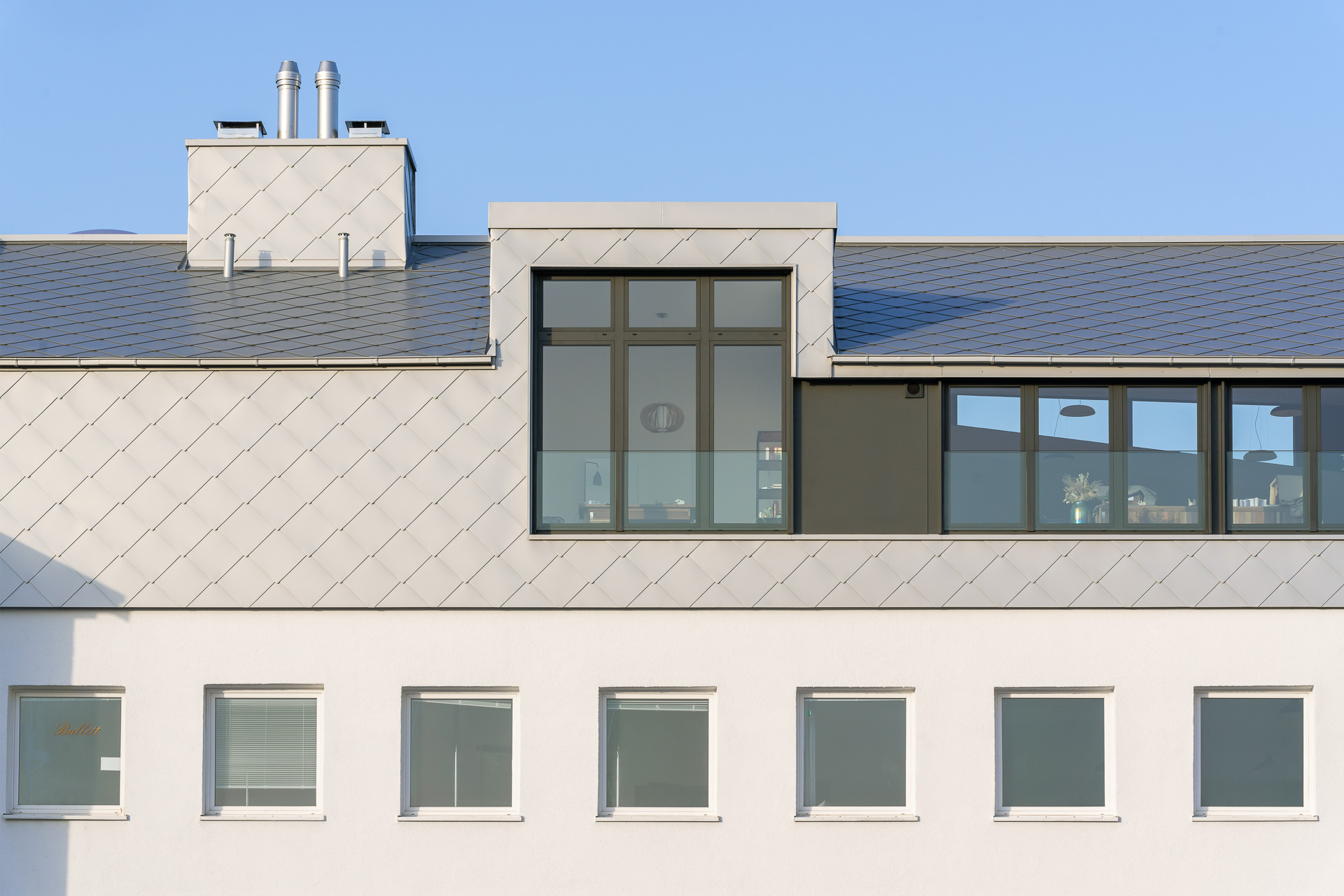 Es gelingt, auf dem vorhandenen Raster des Betonskelettbaus eine städtebaulich und konstruktiv intelligente Form zu kreieren, welche die nachbarlichen Dachfirste und -neigungen übernimmt.