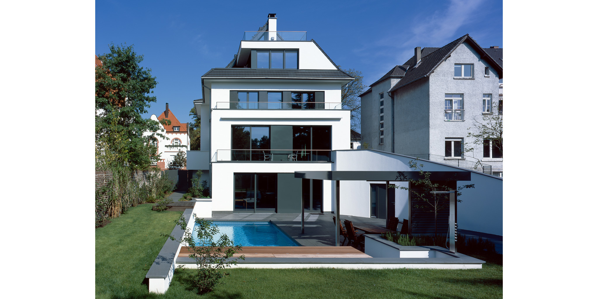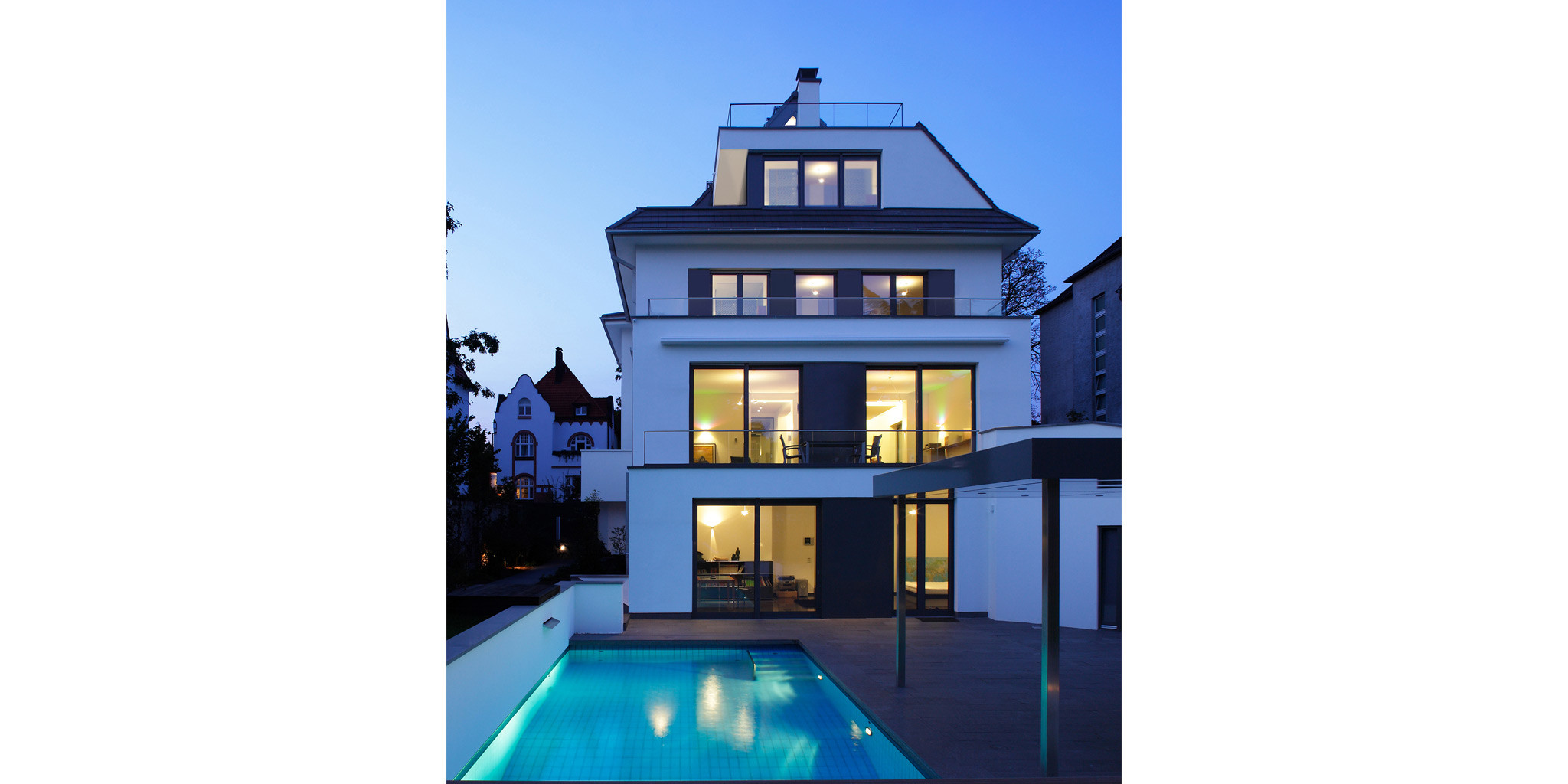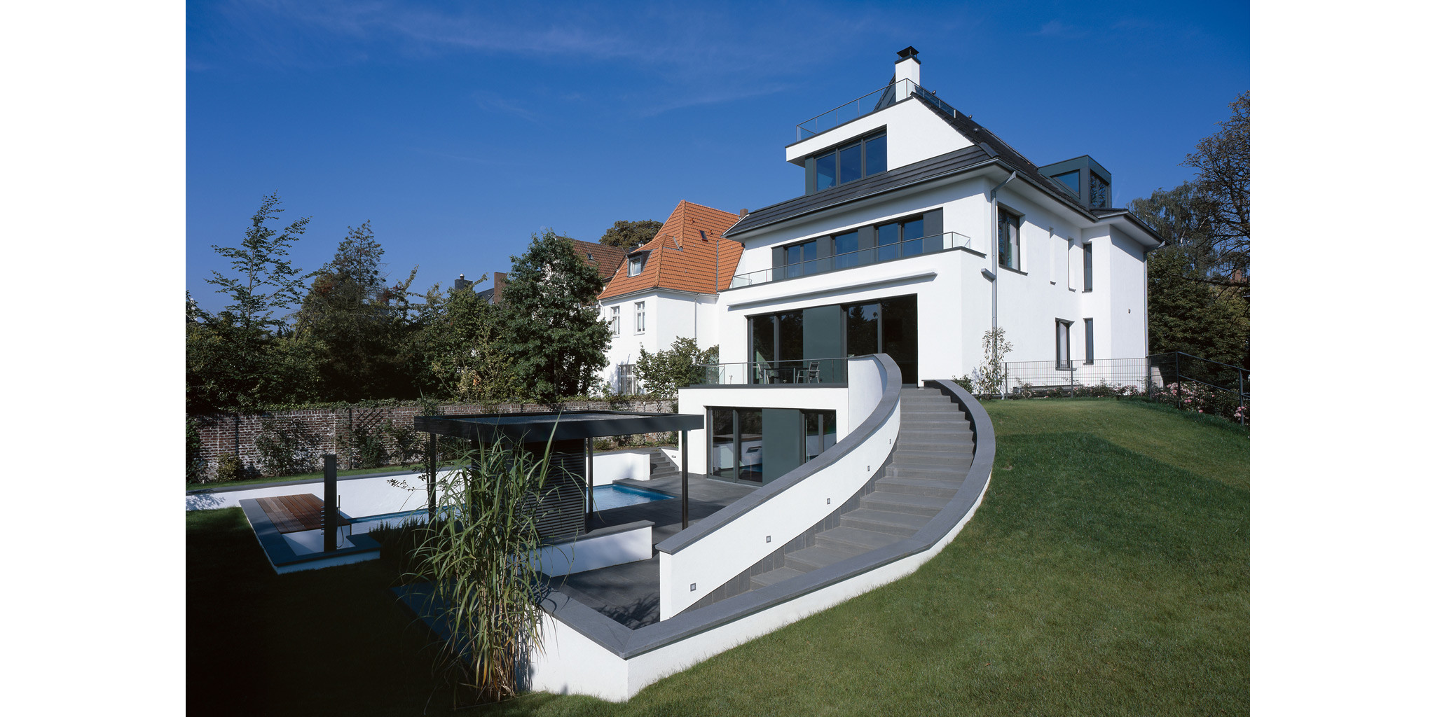 Das ursprüngliche Offizierskasino war nach dem Krieg bereits einfach umgebaut worden. Durch unsere Umplanung im Jahr 2009 verwandelte es sich nun zur modernen Stadtvilla mit Schwimmbad, Einliegerwohnung und Tiefgarage.