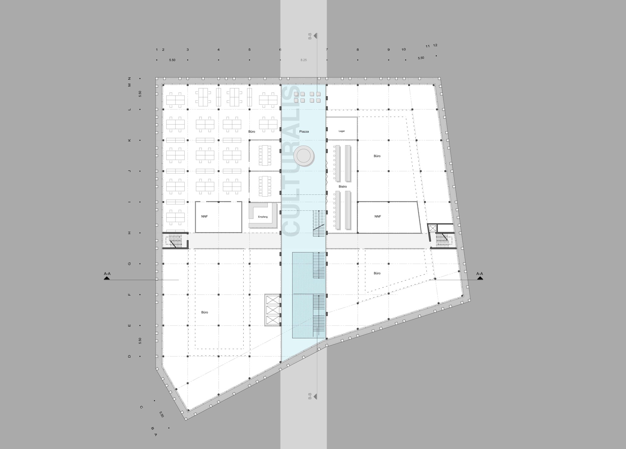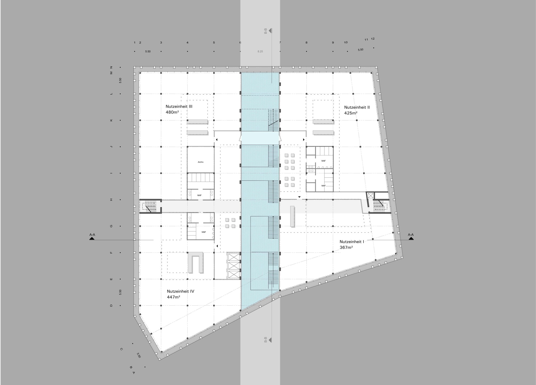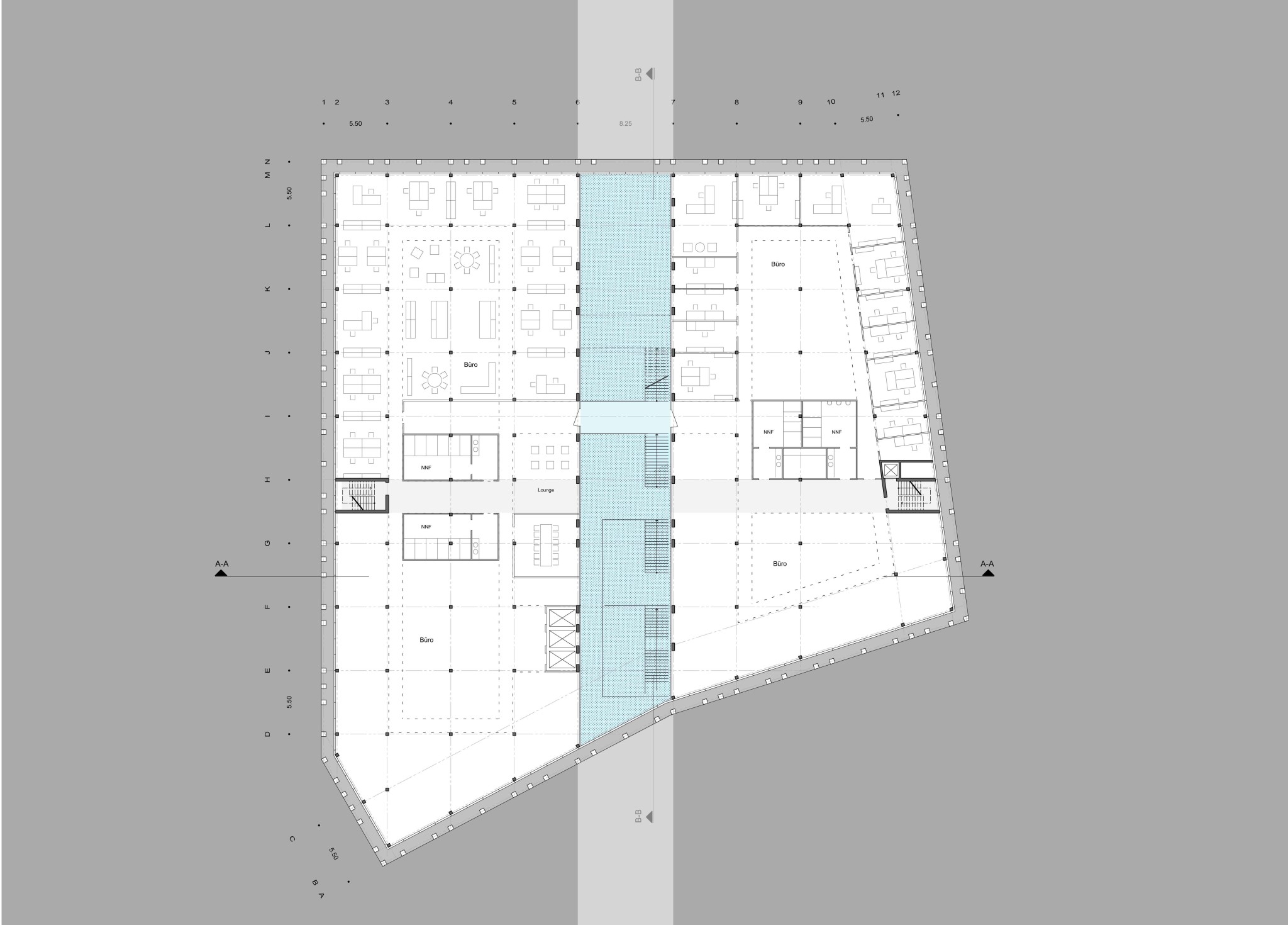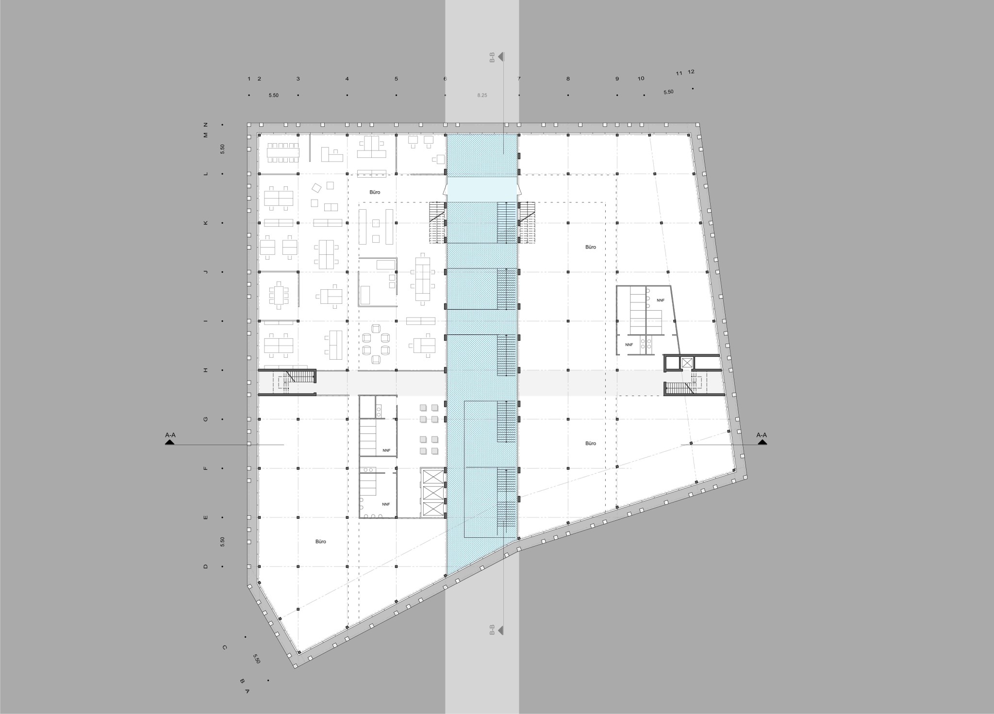 Die, durch diese Zerschneidung entstehenden Blocks, bieten eine Rasterstruktur für sämtliche Bürotypen (Zelle, Kombi, Großraum) und sind sogar als Wohnfläche nutzbar.