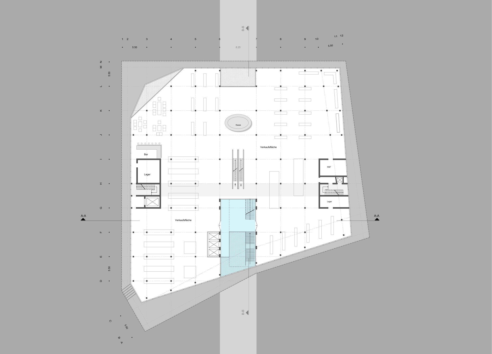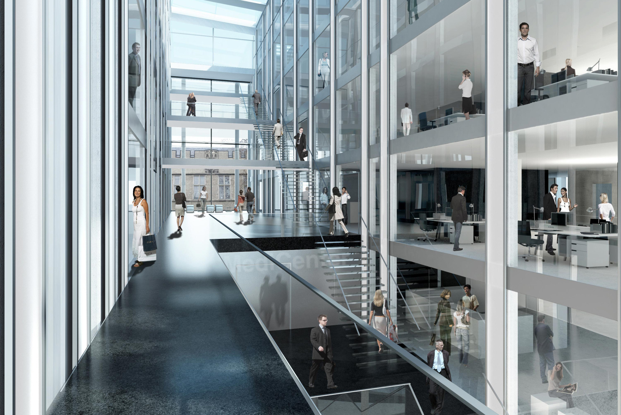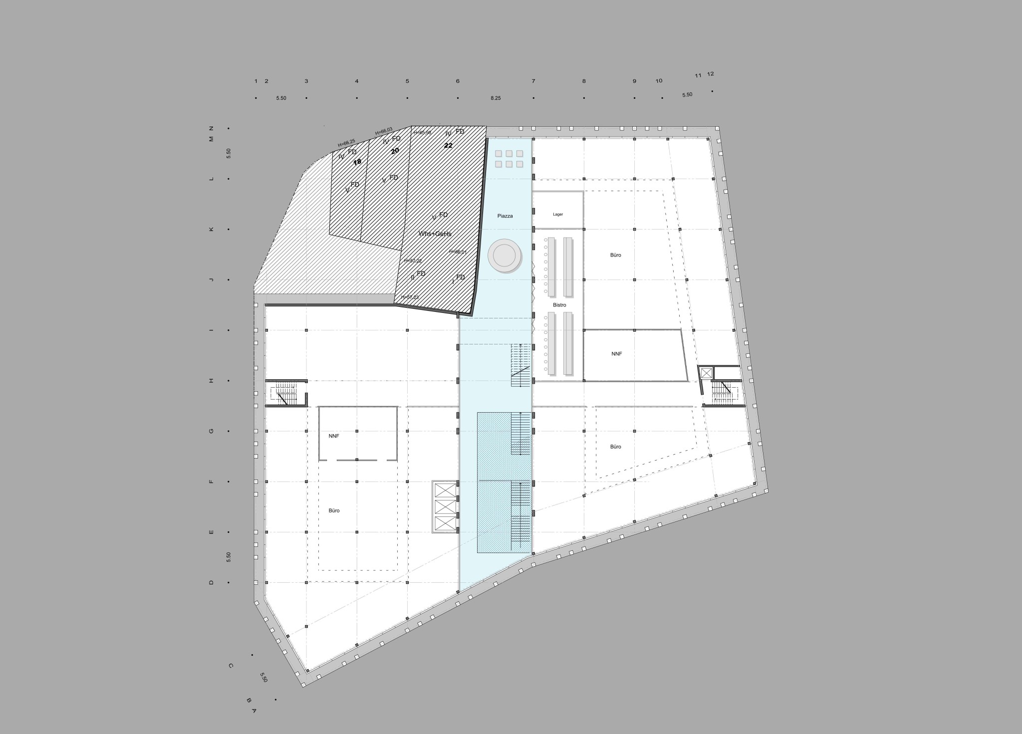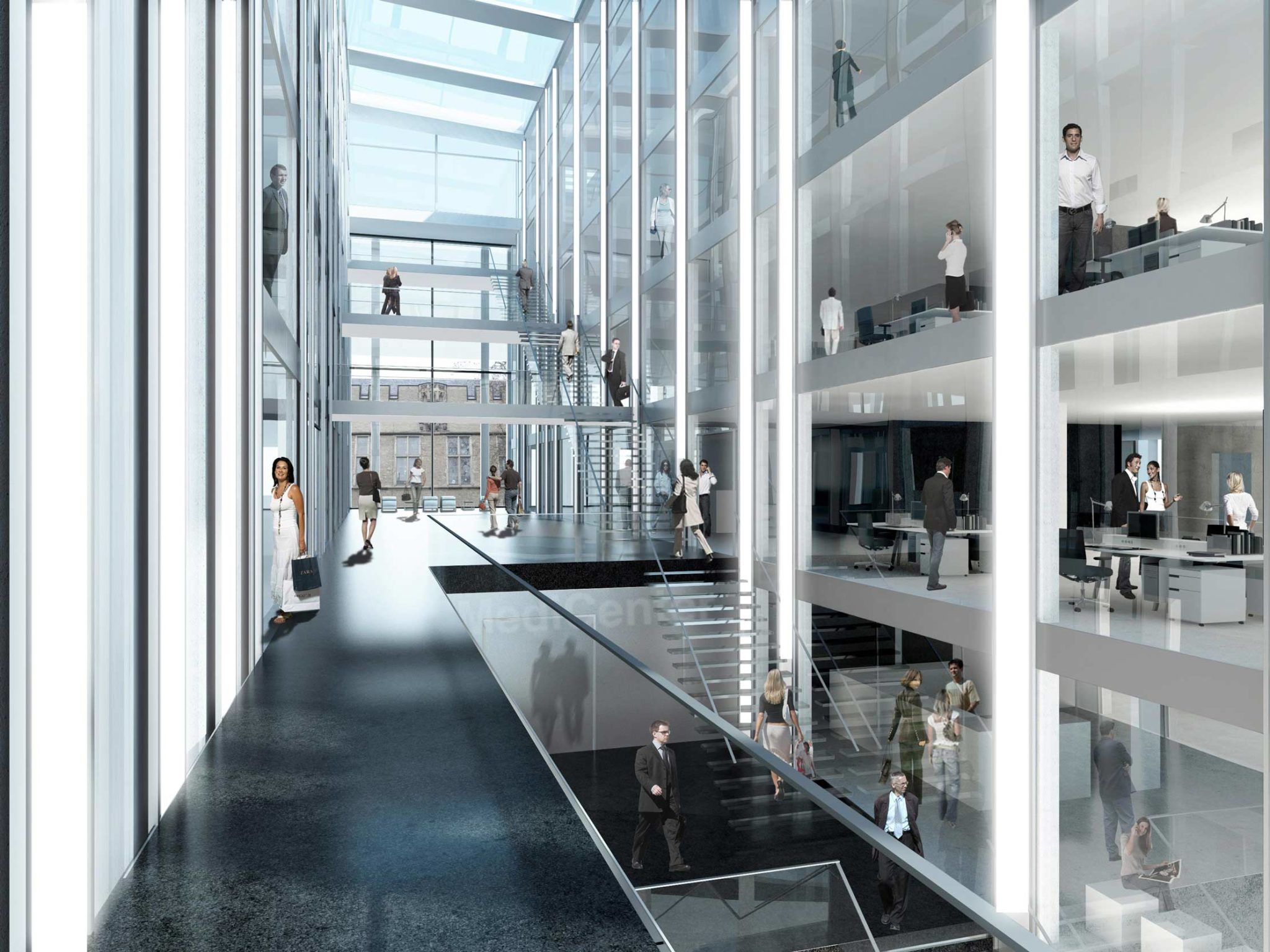 Die, durch diese Zerschneidung entstehenden Blocks, bieten eine Rasterstruktur für sämtliche Bürotypen (Zelle, Kombi, Großraum) und sind sogar als Wohnfläche nutzbar.