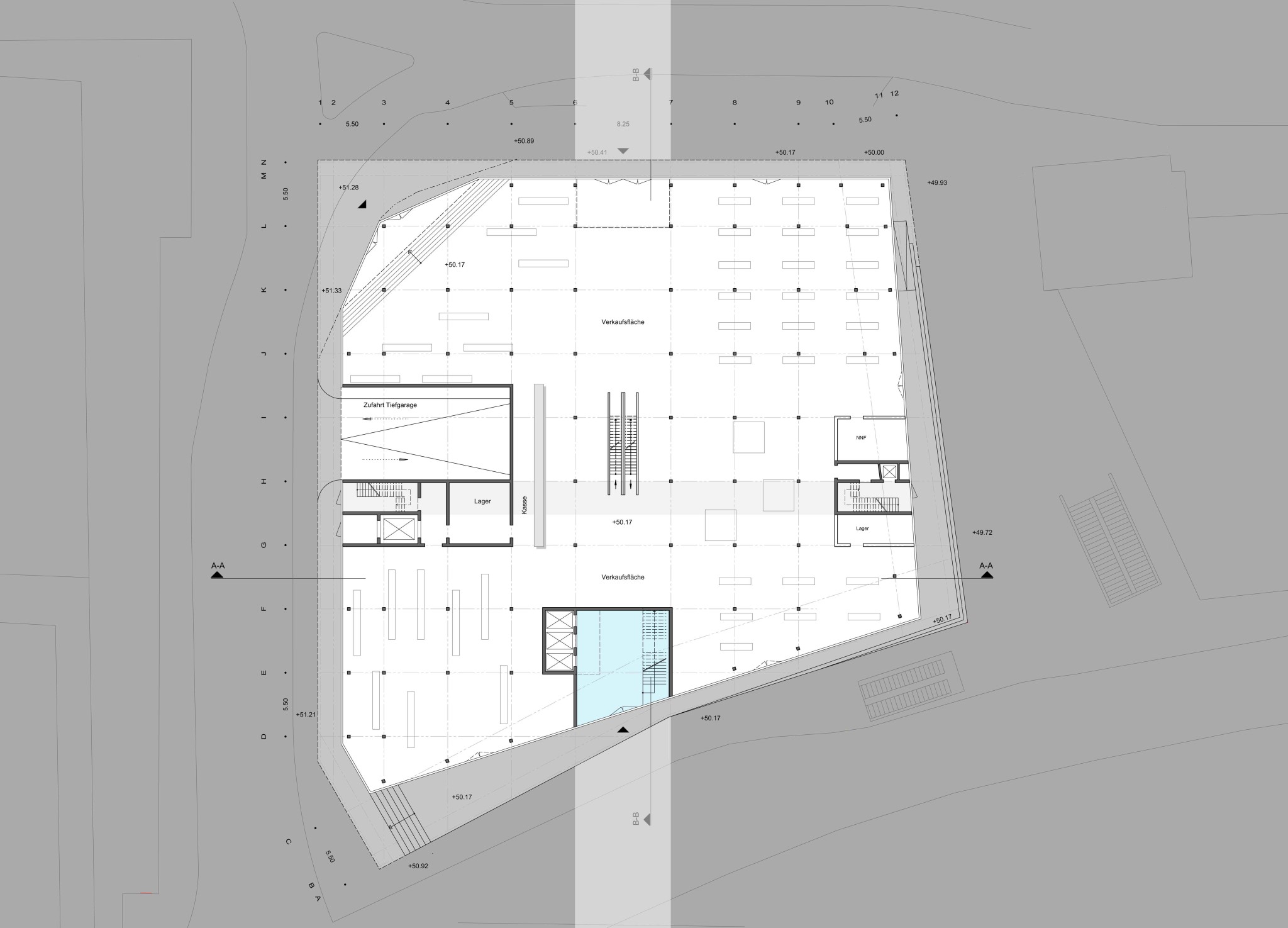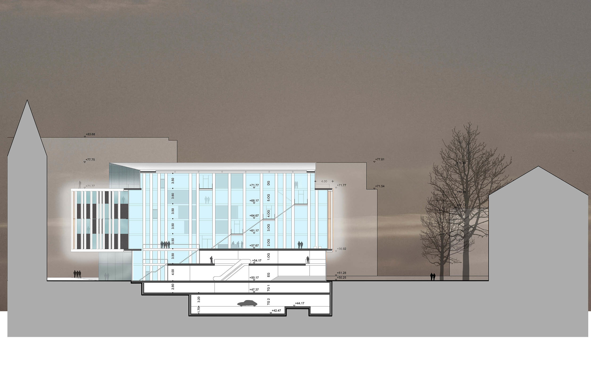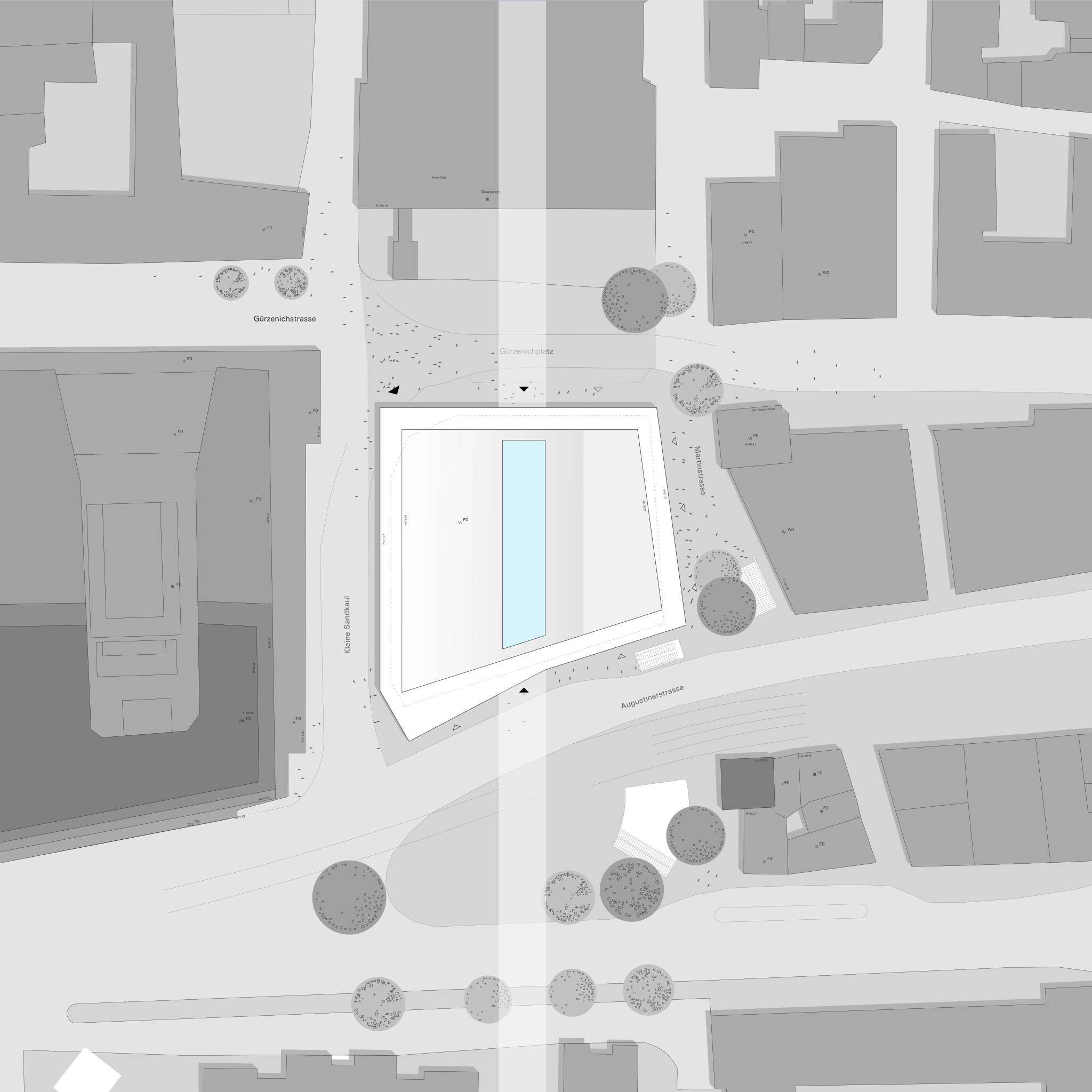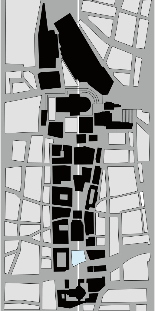 Auf gegebener Parzelle liegt der Kubus mittig auf der stadtgeschichtlichen Achse Via Culturalis.